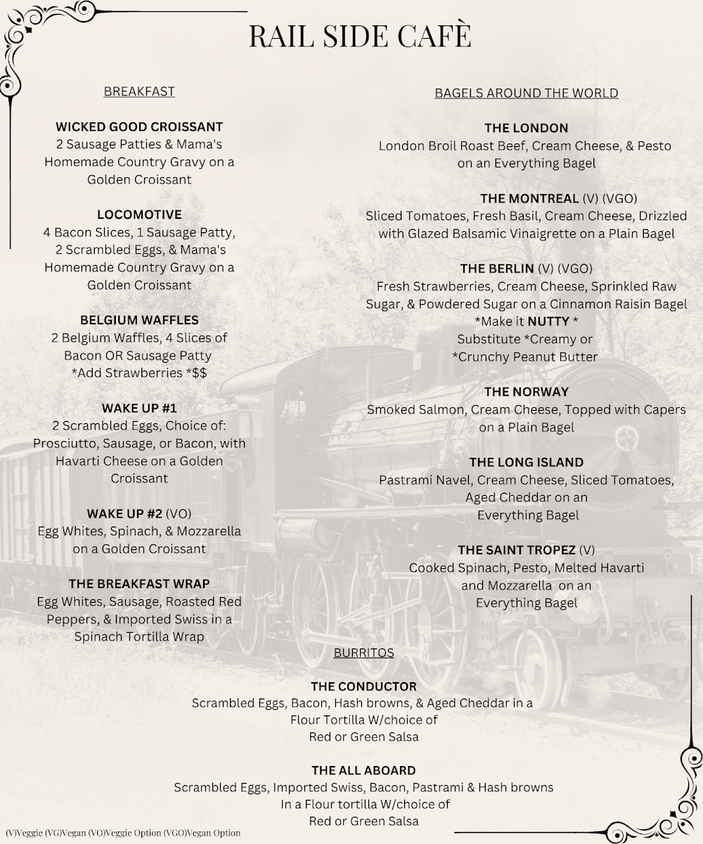 The menu at Rail Side Cafe is a celebration of flavorful offerings, catering to all palates. Start your day with a rich and robust Espresso for just $3.00, or treat yourself to a creamy Mocha Latte at $5.49. For those who appreciate sweet indulgence, the Caramel Sea Salt Express is a must-try, combining ice coffee with caramel drizzle and heavy cream for just $5.99. And if you’re in the mood for a hearty meal, the Turkey Panini, featuring Boars Head roasted turkey breast, spinach, and pesto on grilled ciabatta for $15.49, is an absolute standout.